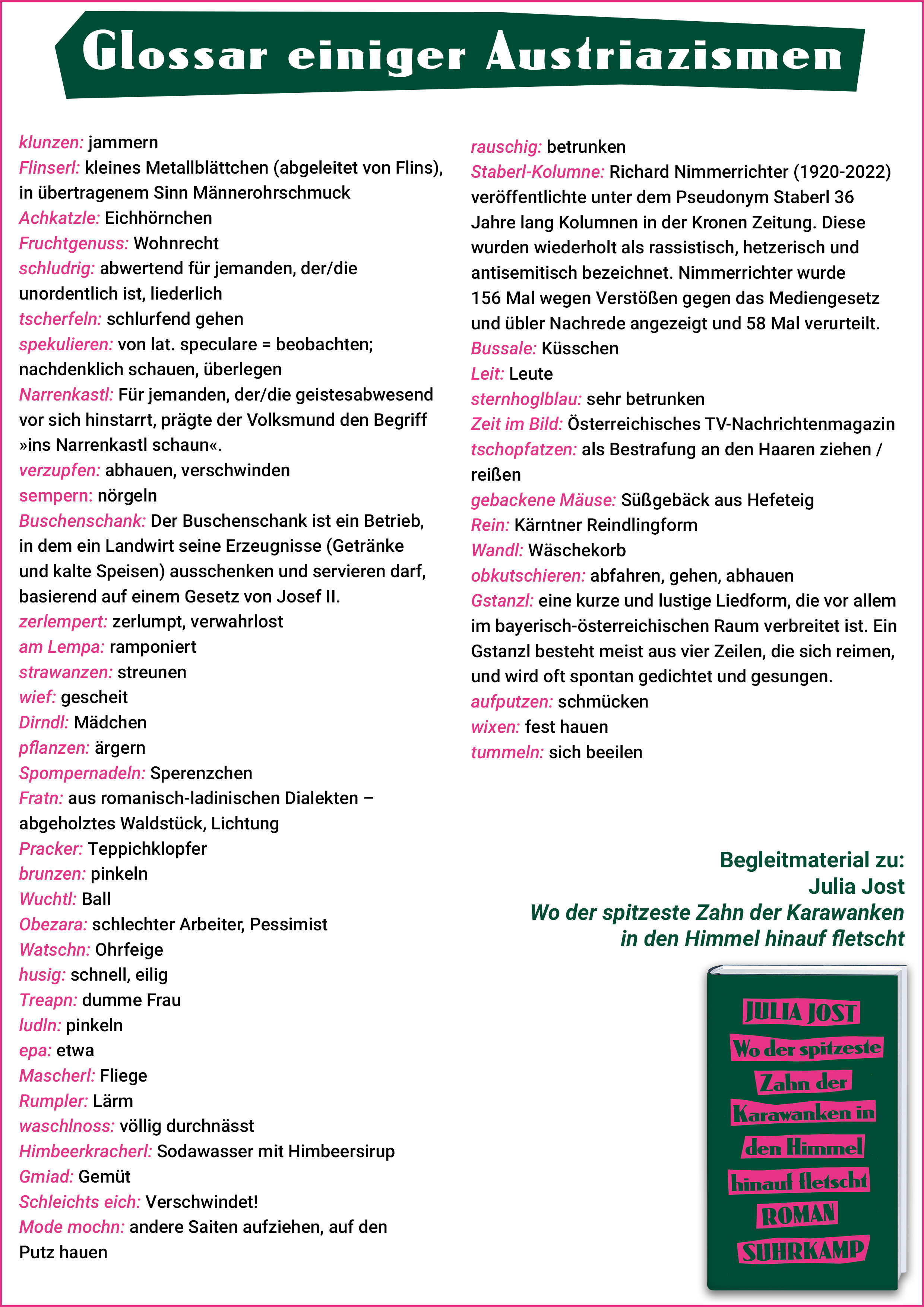 Hier entdecken Sie die Schauplätze des Romans, erfahren mehr zum Hintergrund der Handlung, lernen Austriazismen kennen – und können sich die passende Musik zum Buch anhören, während Sie Wo der spitzeste Zahn der Karawanken in den Himmel hinauf fletscht lesen.