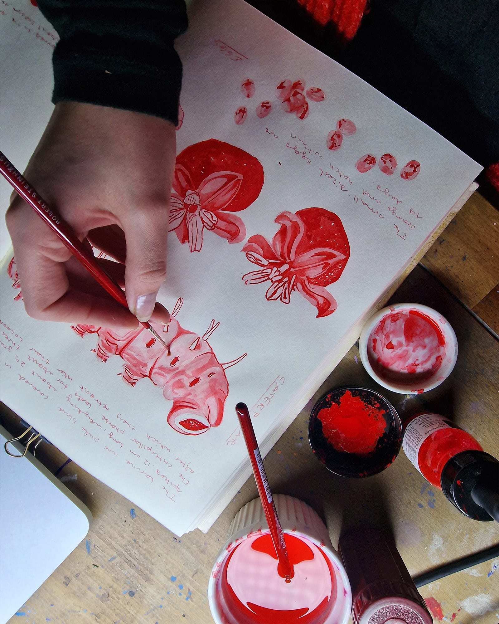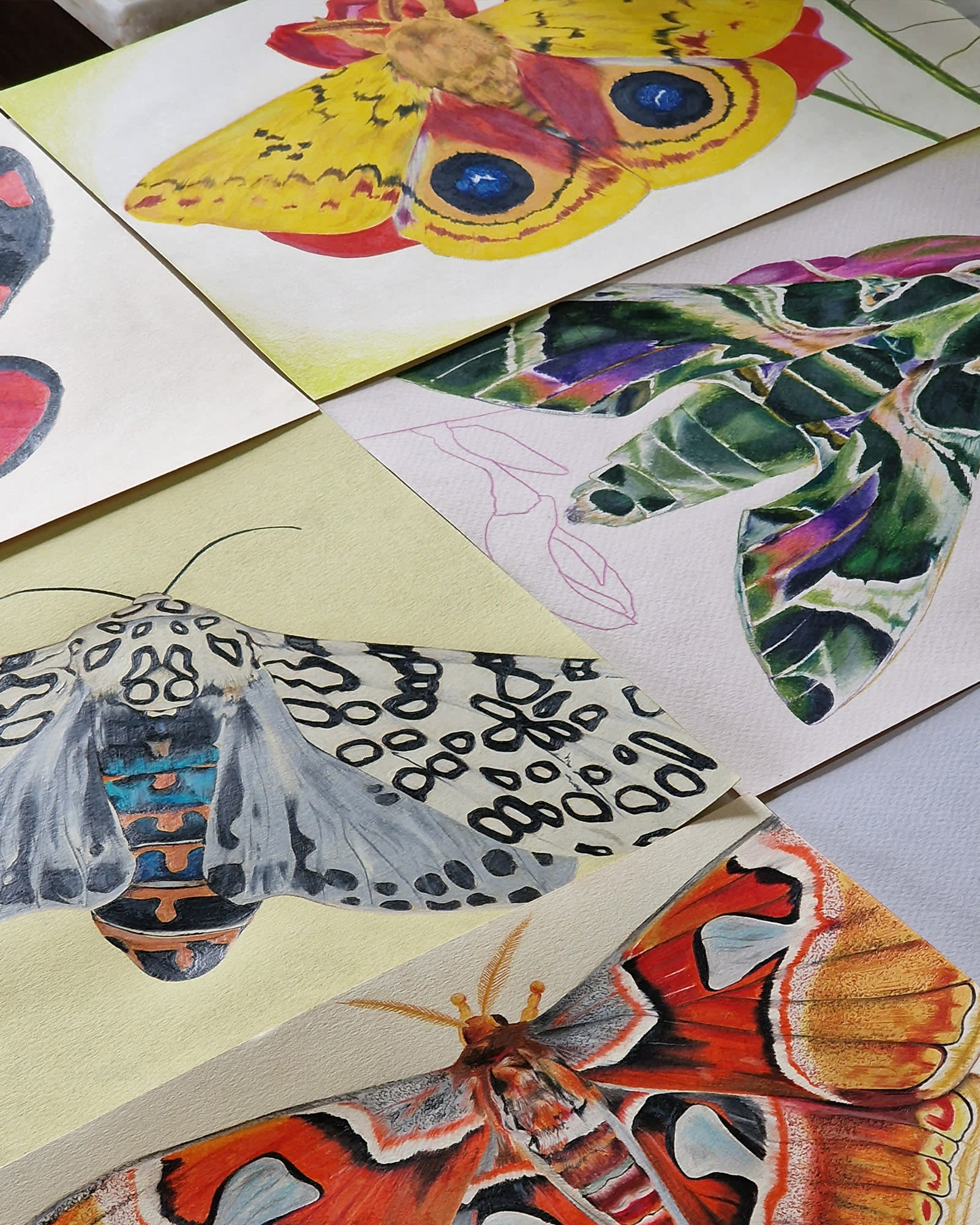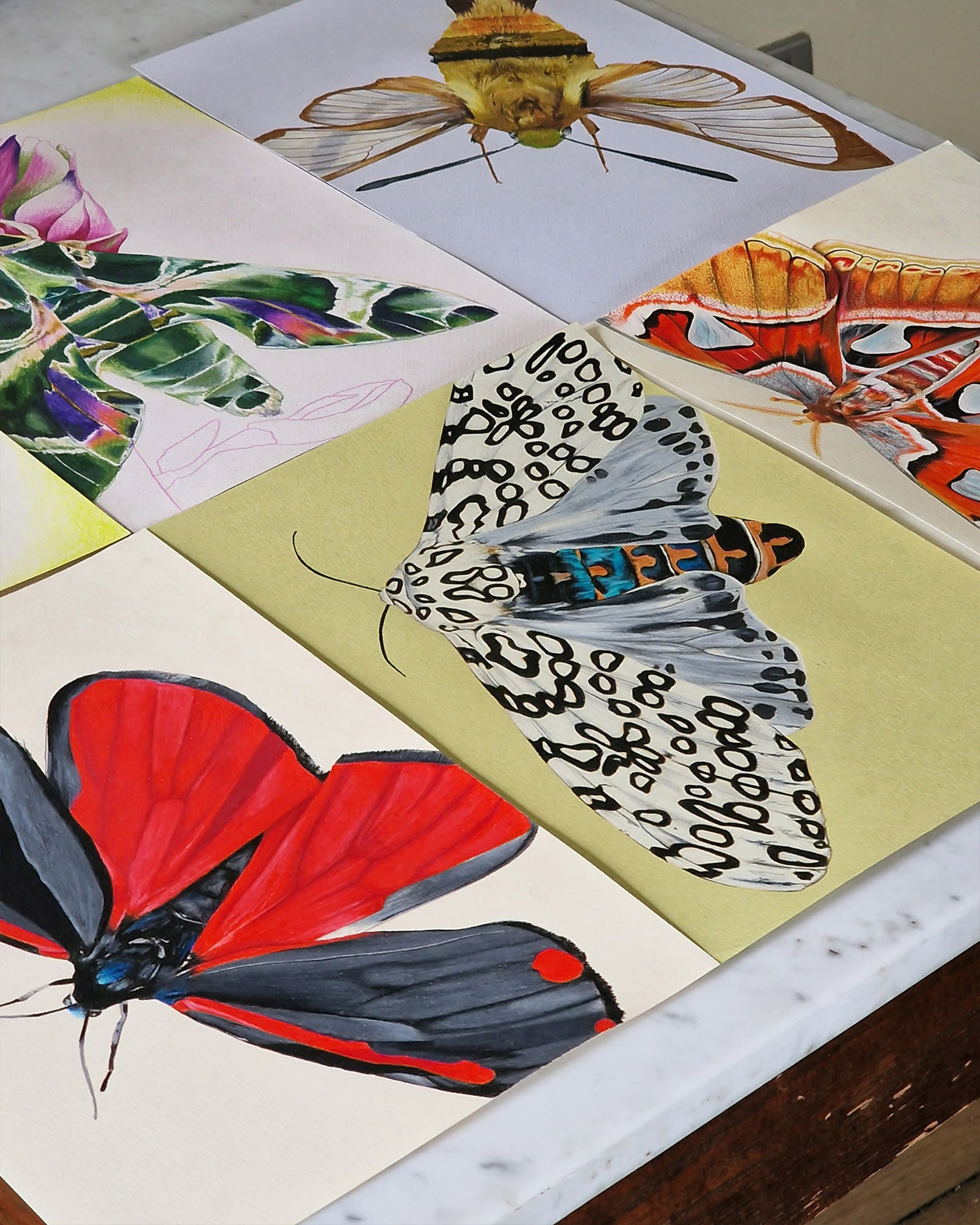In ihrem neuen Buch Nachtfalter lädt Cornelia Funke uns ein, die erstaunliche Welt der Nachtfalter mit ganz neuen Augen zu betrachten. Die lebendigen Illustrationen von Jessica Frascht erwecken die eindrucksvolle Schönheit und Vielfalt dieser außergewöhnlichen Wesen zum Leben. Entstanden ist das gemeinsame Projekt in der italienischen Künstlerresidenz von Cornelia Funke – ein Haus über den Hügeln der Toskana, in das die Autorin ganzjährig junge Künstler:innen einlädt, um an eigenen Projekten zu arbeiten, sich untereinander auszutauschen und von der kreativen Gemeinschaft inspirieren zu lassen. Dort arbeitete Frascht auch an den Nachtfaltern. Wir haben Fotografien der Illustratorin zusammengestellt, die diesen Schaffensprozess dokumentieren.