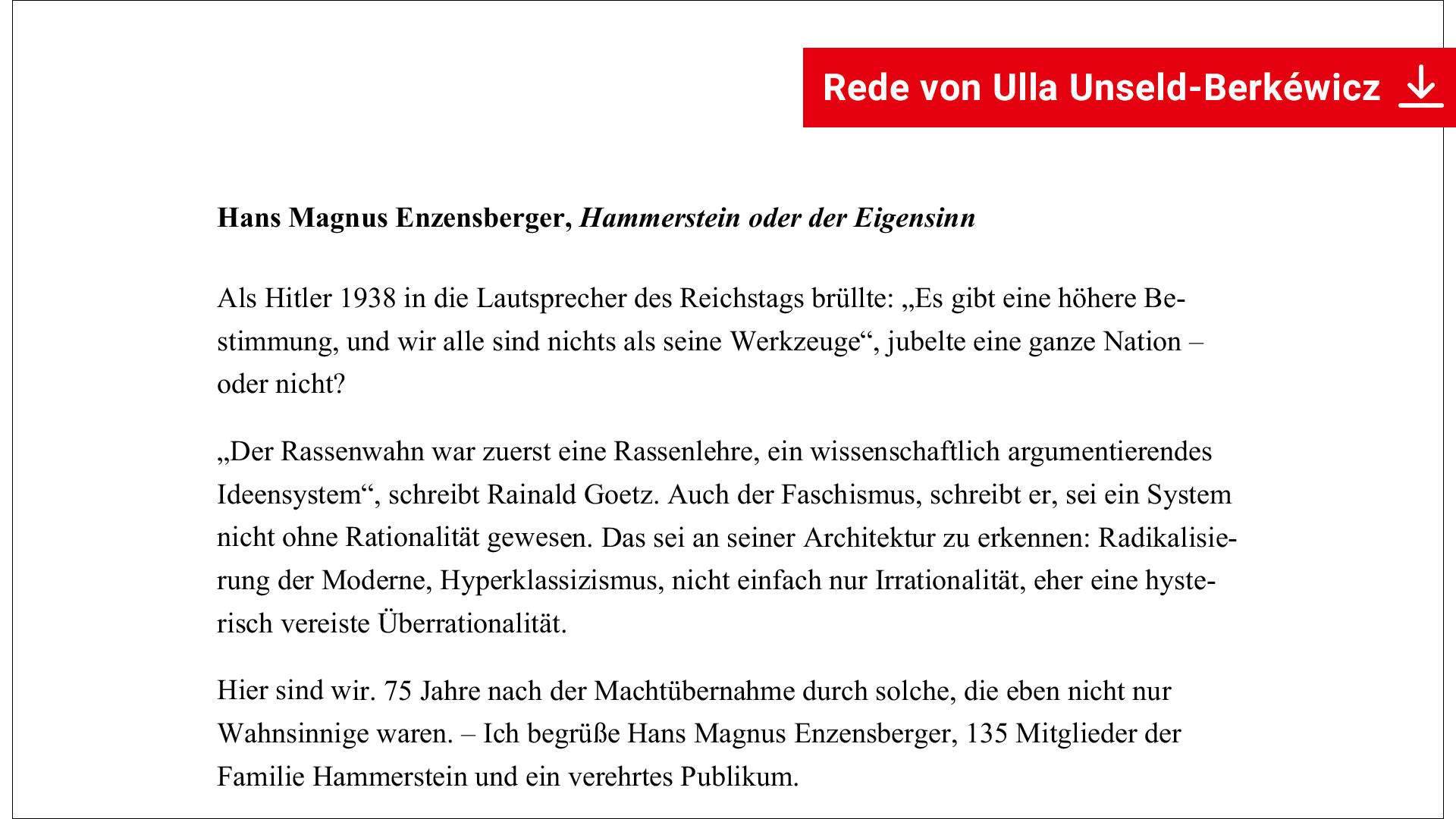 Rede von Ulla Unseld-Berkéwicz anläßlich der Präsentation des Buches vor der Familie von Hammerstein am 30.1.2008 im Bendlerblock.